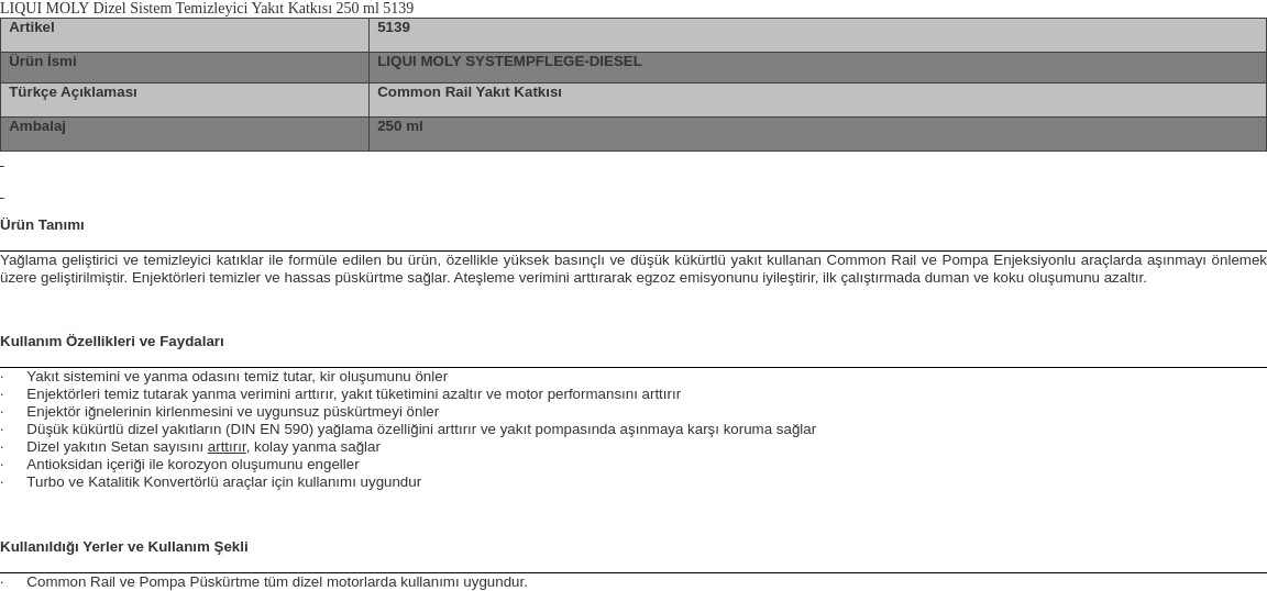 Liqui Moly Dizel Sistem Temizleyici Yakıt Katkısı 250 ml (5139)